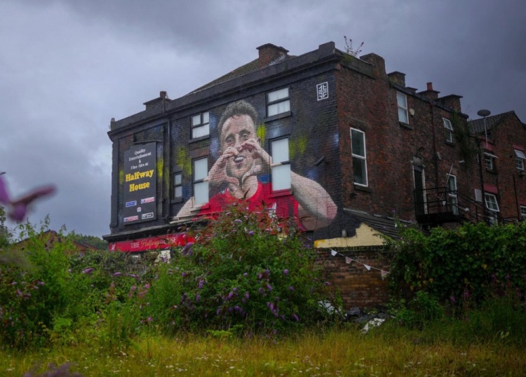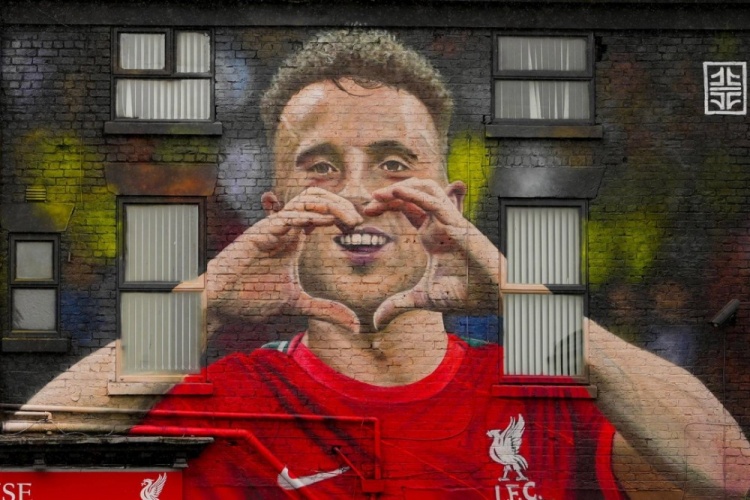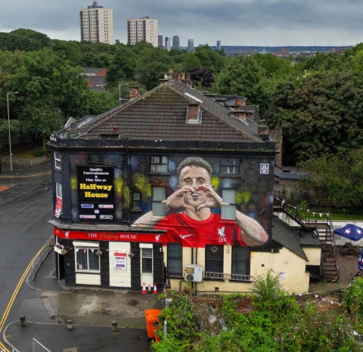 这幅画描绘了若塔庆祝进球的瞬间。壁画位于距离红军主场不远处的半路屋酒吧外墙上,这里离若塔自2020年9月从狼队加盟后享受过无数欢乐时光的地方仅几步之遥。